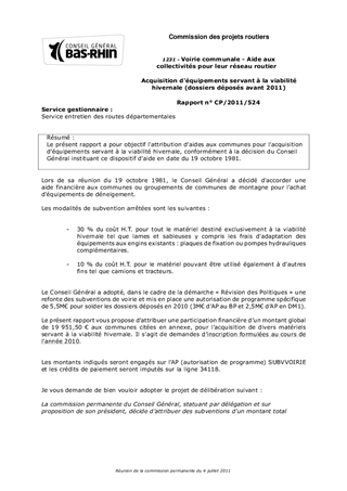 Le présent rapport a pour objectif lattribution daides aux communes pour lacquisition déquipements servant à la viabilité hivernale, conformément à la décision du Conseil Général instituant ce dispositif daide en date du 19 octobre 1981.