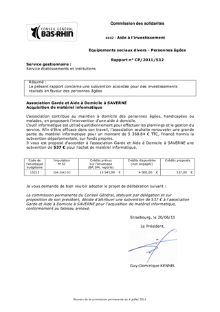Le présent rapport concerne une subvention accordée pour des investissements réalisés en faveur des personnes âgées