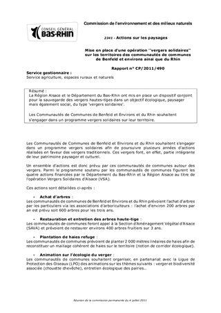 La Région Alsace et le Département du Bas-Rhin ont mis en place un dispositif conjoint pour la sauvegarde des vergers hautes-tiges dans un objectif écologique, paysager mais également social, du type 'vergers solidaires'. Les Communautés de Communes de Benfeld et Environs et du Rhin souhaitent s'engager dans un programme vergers solidaires sur leur territoire.