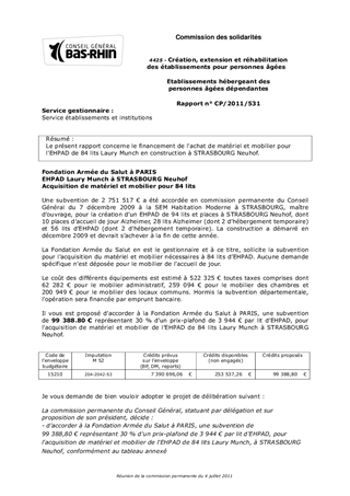 Le présent rapport concerne le financement de l'achat de matériel et mobilier pour l'EHPAD de 84 lits Laury Munch en construction à STRASBOURG Neuhof.