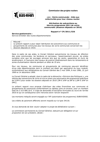 Le présent rapport a pour objet l'attribution de subventions aux communes et groupements de communes pour les travaux de voirie communale concernant les dossiers déposés en 2010.
