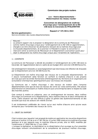 Le présent rapport vise à proposer la désignation de la commune de Pfalzweyer comme maître douvrage unique pour laménagement de la RD 158 en agglomération, chargée à ce titre dexercer les attributions relevant de la maîtrise douvrage pour la chaussée départementale, et à autoriser le Président à signer la convention à intervenir entre la commune de Pfalzweyer et le Département (convention ayant pour objet la désignation du maître douvrage unique pour lensemble de lopération).