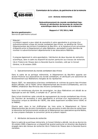 Le présent rapport a pour objet de soumettre à votre approbation le principe d'un subventionnement unique du monde combattant bas-rhinois, au bénéfice de l'Union Départementale des Anciens Combattant du Bas-Rhin, et la signature d'une convention d'objectifs entre le Département et cette fédération, permettant à cette dernière de reverser le subventionnement départemental à ses associations fédérées. Il propose également à votre approbation, l'attribution de deux bourses de recherche scientifique, dans le cadre du dispositif de soutien particulier aux travaux de recherche liés à l'histoire de l'Alsace dans la Seconde Guerre mondiale, voté par le Conseil Général, le 26 octobre 2009.