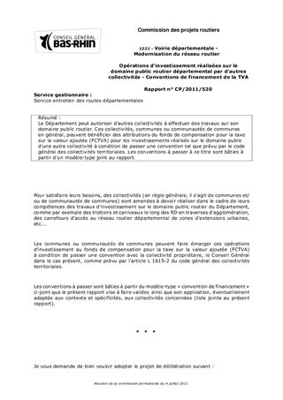 Le Département peut autoriser dautres collectivités à effectuer des travaux sur son domaine public routier. Ces collectivités, communes ou communautés de communes en général, peuvent bénéficier des attributions du fonds de compensation pour la taxe sur la valeur ajoutée (FCTVA) pour les investissements réalisés sur le domaine public dune autre collectivité à condition de passer une convention tel que prévu par le code général des collectivités territoriales. Les conventions à passer à ce titre sont bâties à partir dun modèle-type joint au rapport.