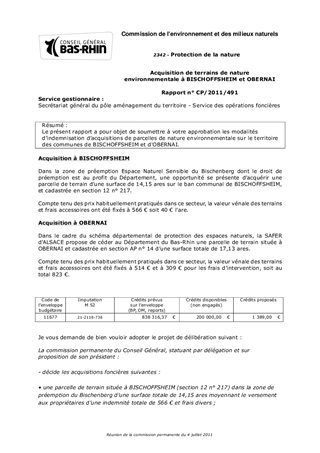 Le présent rapport a pour objet de soumettre à votre approbation les modalités dindemnisation dacquisitions de parcelles de nature environnementale sur le territoire des communes de BISCHOFFSHEIM et d'OBERNAI.