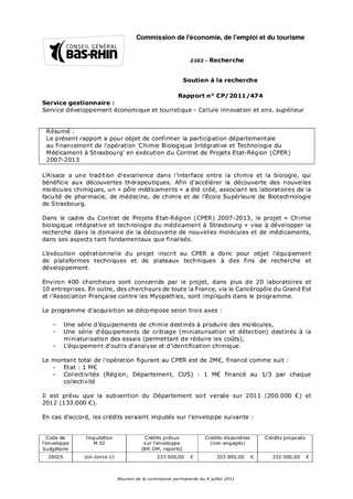 Le présent rapport a pour objet de confirmer la participation départementale au financement de lopération 'Chimie Biologique Intégrative et Technologie du Médicament à Strasbourg' en exécution du Contrat de Projets Etat-Région (CPER) 2007-2013