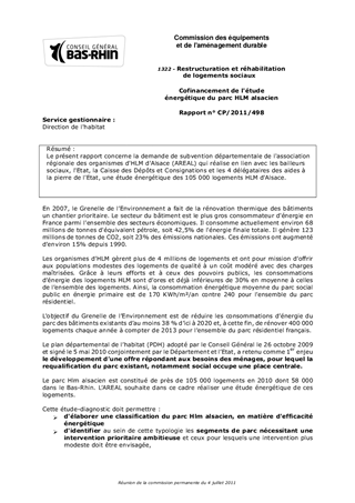 Le présent rapport concerne la demande de subvention départementale de l'association régionale des organismes d'HLM d'Alsace (AREAL) qui réalise en lien avec les bailleurs sociaux, l'Etat, la Caisse des Dépôts et Consignations et les 4 délégataires des aides à la pierre de l'Etat, une étude énergétique des 105 000 logements HLM d'Alsace.