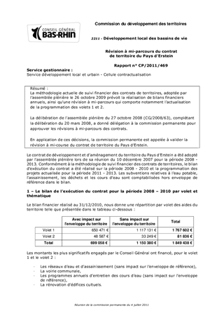 La méthodologie actuelle de suivi financier des contrats de territoires, adoptée par lassemblée plénière le 26 octobre 2009 prévoit la réalisation de bilans financiers annuels, ainsi quune révision à mi-parcours qui comporte notamment lactualisation de la programmation des volets 1 et 2. La délibération de l'assemblée plénière du 27 octobre 2008 (CG/2008/63), complétant la délibération du 20 mars 2008, a donné délégation à la commission permanente pour approuver les révisions à mi-parcours des contrats. En application de ces décisions, la commission permanente est appelée à valider la révision à mi-course du contrat de territoire du Pays d'Erstein.