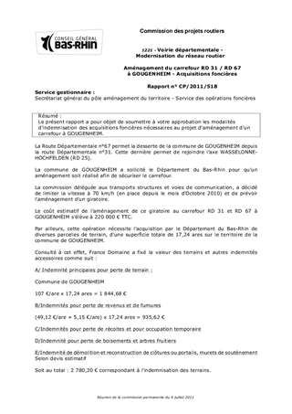 Le présent rapport a pour objet de soumettre à votre approbation les modalités d'indemnisation des acquisitions foncières nécessaires au projet d'aménagement d'un carrefour à GOUGENHEIM.