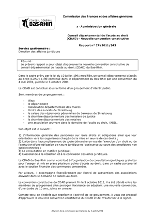 Le présent rapport a pour objet d'approuver la nouvelle convention constitutive du conseil départemental de l'accès au droit (CDAD) du Bas-Rhin.