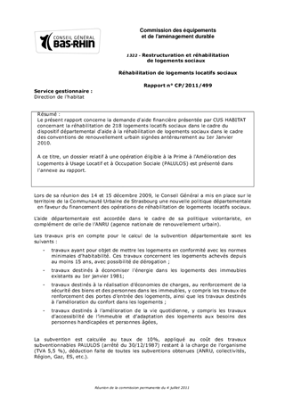 Le présent rapport concerne la demande d'aide financière présentée par CUS HABITAT concernant la réhabilitation de 218 logements locatifs sociaux dans le cadre du dispositif départemental d'aide à la réhabilitation de logements sociaux dans le cadre des conventions de renouvellement urbain signées antéreurement au 1er Janvier 2010. A ce titre, un dossier relatif à une opération éligible à la Prime à l'Amélioration des Logements à Usage Locatif et à Occupation Sociale (PALULOS) est présenté dans l'annexe au rapport.