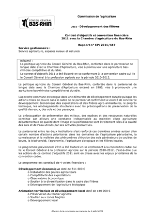 La politique agricole du Conseil Général du Bas-Rhin, confortée dans le partenariat de longue date avec la Chambre dAgriculture, vise à promouvoir une agriculture bas-rhinoise compétitive et durable. Le contrat d'objectifs 2011 a été élaboré en se conformant à la convention cadre qui lie le Conseil Général à la profession agricole sur la période 2010-2012.