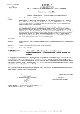 Le Conseil Général a approuvé le principe de l'expérimentation du projet ''Bonus Energie des collèges''. Des collèges volontaires et les agents techniques bénéficient de l'accompagnement technique et pédagogique de sensibilisation aux économies d'énergie de lAssociation ''Alter-Alsace Energies''. Une convention financière doit être conclue avec l'association qui accompagne les collèges