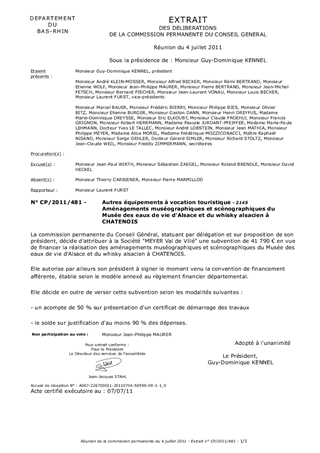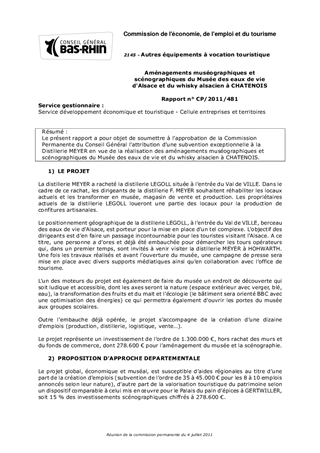 Le présent rapport a pour objet de soumettre à lapprobation de la Commission Permanente du Conseil Général lattribution dune subvention exceptionnelle à la Distillerie MEYER en vue de la réalisation des aménagements muséographiques et scénographiques du Musée des eaux de vie et du whisky alsacien à CHATENOIS.