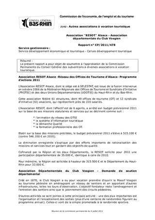 Le présent rapport a pour objet de soumettre à lapprobation de la Commission Permanente du Conseil Général des subventions à diverses associations à vocation touristique.