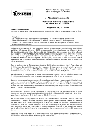 Le présent rapport a pour objet de soumettre à la validation de la commission permanente la vente de l'immeuble 17 rue du Général Leclerc à Schiltigheim à DOMIAL, et l'acquisition de locaux 22 rue de la Mairie à Schiltigheim auprès du Foyer Moderne de Schiltigheim.
