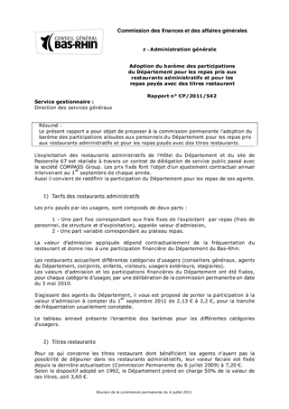 Le présent rapport a pour objet de proposer à la commission permanente l'adoption du barème des participations allouées aux personnels du Département pour les repas pris aux restaurants administratifs et pour les repas payés avec des titres restaurants.