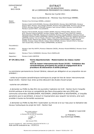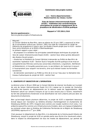 Le Conseil Général du Bas-Rhin, dans sa séance du 25 juin 2007, a approuvé le bilan de la concertation prévue par l'article L 300-2 du code de l'urbanisme et validé les éléments de programme à retenir pour les études davant-projet pour la VLIO - section Sud, entre Holtzheim et la RD63 à Oberhausbergen. Le présent rapport a pour objet : - de proposer à la validation les principales caractéristiques techniques du projet de Voie de Liaison Intercommunale Ouest (VLIO) - section Sud, telles quelles découlent des études davant-projet ; - dautoriser le Président du Conseil Général à demander au Préfet du Bas-Rhin de soumettre lopération VLIO - Section Sud à lenquête dutilité publique et de mise en compatibilité des POS des communes concernées (Holtzheim, Lingolsheim, Wolfisheim et Eckbolsheim), à lenquête parcellaire puis, le cas échéant, de l'autoriser à recourir à lexpropriation pour acquérir les terrains, ainsi qu'à réaliser toutes les formalités successives - de demander autorisation au Préfet au titre de la loi sur leau pour la réalisation des travaux hydrauliques du projet de VLIO - section Sud.