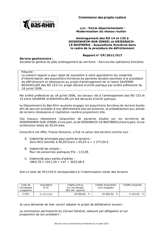 Le présent rapport a pour objet de soumettre à votre approbation les modalités d'indemnisation des acquisitions foncières de parcelles boisées soumises à la procédure de défrichement et nécessaires au projet d'aménagement de la liaison SAVERNE-BOUXWILLER des RD 133-14, projet déclaré d'utilité publique par arrêté préfectoral du 18 juillet 2006.