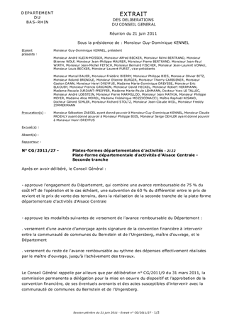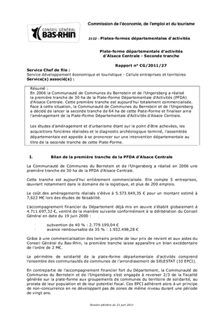 En 2006 la Communauté de Communes du Bernstein et de l'Ungersberg a réalisé la première tranche de 30 ha de la Plate-Forme Départementale d'Activités (PFDA) d'Alsace Centrale. Cette première tranche est aujourd'hui totalement commercialisée. Face à cette situation, la Communauté de Communes du Bernstein et de l'Ungersberg a décidé de lancer la seconde tranche de 64 ha de cette Plate-Forme et finaliser ainsi l'aménagement de la Plate-Forme Départementale d'Activités d'Alsace Centrale. Les études d'aménagement et d'urbanisme étant sur le point d'être achevées, les acquisitions foncières réalisées et le diagnostic archéologique terminé, l'assemblée départementale est appelée à se prononcer sur une intervention départementale au titre de la seconde tranche de cette Plate-Forme.