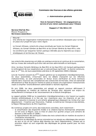 Une refonte de l'organisation institutionnelle est une condition nécessaire pour la mise en place d'un projet fort pour notre région. Le Conseil dAlsace, collectivité unique constituée par fusion du Conseil Régional dAlsace, du Conseil Général du Bas-Rhin et du Conseil Général du Haut-Rhin, crée les conditions par lesquelles laction publique refondée pourra répondre aux enjeux stratégiques et territoriaux de lAlsace.