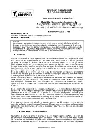 Dans le cadre de la révision des politiques publiques, le Conseil Général a décidé de déployer une mission de conseil auprès des collectivités hors Communauté Urbaine de Strasbourg pour lexercice de leurs compétences en urbanisme et en aménagement. Le présent rapport a pour objet de préciser la nature, la forme, le rendu et les modalités de déploiement de ce conseil en urbanisme et en aménagement.