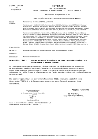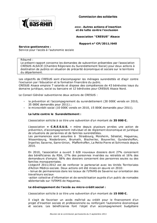 Le présent rapport concerne les demandes de subvention présentées par lassociation CRESUS ALSACE (Chambre Régionale du Surendettement Social) pour deux actions à destination de publics en situation de précarité économique et sociale sur le territoire du département.