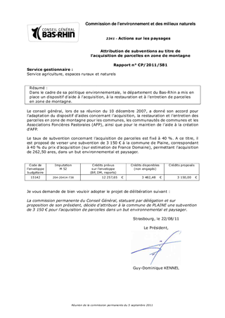 Dans le cadre de sa politique environnementale, le département du Bas-Rhin a mis en place un dispositif d'aide à l'acquisition, à la restauration et à l'entretien de parcelles en zone de montagne.