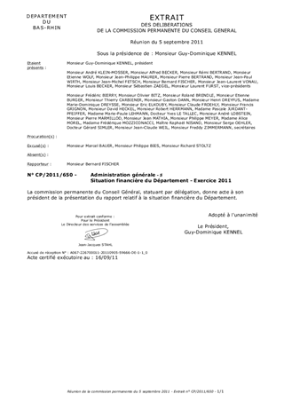 Situation financière du Département - Exercice 2011 Resumé Le présent rapport retrace la situation financière du Département. Pièces jointes Délibération Rapport Assemblée : Commission Permanente Date : 05/09/2011 Rapporteur : Monsieur Bernard FISCHER Collectivité : Conseil départemental du Bas-Rhin Direction : Direction des finances et de la commande publique Service : Service des finances Domaine : Non renseigné Commission : M - Commission des finances et des affaires générales