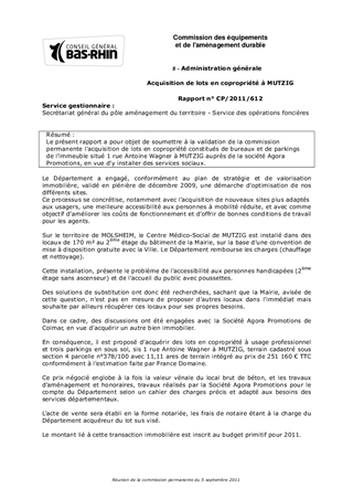 Le présent rapport a pour objet de soumettre à la validation de la commission permanente l'acquisition de lots en copropriété constitués de bureaux et de parkings de l'immeuble situé 1 rue Antoine Wagner à MUTZIG auprès de la société Agora Promotions, en vue d'y installer des services sociaux.