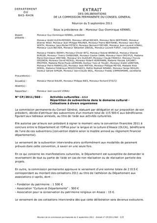 Le présent rapport a pour objet de soumettre à votre approbation les propositions d'intervention du département au titre des activités culturelles ainsi que le versement du montant des cotisations 2011 à la Fondation du Patrimoine, à l'association Culture et Départements et à l'association pour la Conservation du Patrimoine Religieux en Alsace.