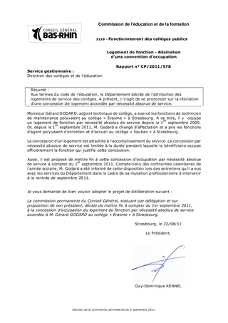 Aux termes du code de léducation, le Département décide de lattribution des logements de service des collèges. A présent, il sagit de se prononcer sur la résiliation dune concession de logement accordée par nécessité absolue de service.