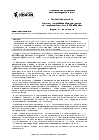 Le présent rapport a pour objet, dans le cadre du projet d'extension de l'Hôtel du Département, de soumettre à votre approbation les modalités financières d'achat et de revente à la SIBAR de l'immeuble 7 rue des Glacières à STRASBOURG pour permettre le relogement de l'Association Paroissiale Saint Louis, et l'acquisition d'une parcelle formant un délaissé appartenant à la Ville de Strasbourg.