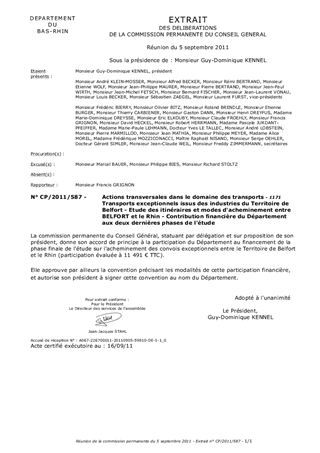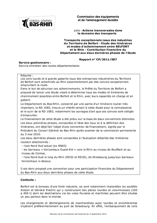 Les colis lourds et à grands gabarits issus des entreprises industrielles du Territoire de Belfort sont acheminés au Rhin essentiellement par des convois exceptionnels empruntant la route. Dans le but de sécuriser ces acheminements, le Préfet du Territoire de Belfort a proposé de lancer une étude visant à déterminer tous les modes et itinéraires de cheminement possibles entre Belfort et le Rhin, avec leurs capacités en charge et en gabarit. Le Département du Bas-Rhin, concerné par une partie d'un itinéraire routier très important, la RD 1083, trouve un intérêt certain à cette étude pour la connaissance et le suivi de la RD 1083, notamment les ouvrages d'art que ces convois sont obligés d'emprunter. Le financement de cette étude a été prévu sur la base de deux conventions distinctes. Les deux premières phases, consacrées à létat des lieux et à la définition des itinéraires, ont déjà fait lobjet dune convention de financement, signée par le Président du Conseil Général du Bas Rhin après examen de la commission permanente du 3 mai 2010. Les deux dernières phases sont consacrées à lévaluation détaillée des itinéraires routiers sélectionnés : - laxe Nord Sud actuel (ex RN83) - les barreaux « horizontaux Ouest-Est » vers le Rhin au niveau de Rouffach et au niveau de Colmar, - laxe Nord-Sud le long du Rhin (RD52 et RD20), de Strasbourg jusquaux barreaux horizontaux ci-dessus. Il est donc proposé une convention pour une participation financière du Département du Bas-Rhin aux deux dernières phases de cette étude.