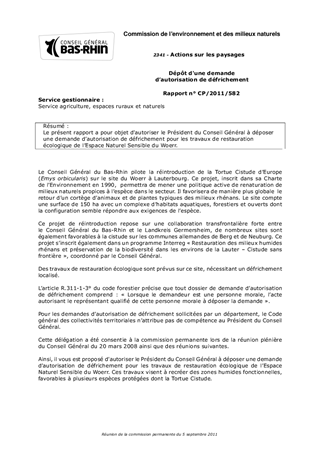 Le présent rapport a pour objet d'autoriser le Président du Conseil Général à déposer une demande dautorisation de défrichement pour les travaux de restauration écologique de lEspace Naturel Sensible du Woerr.