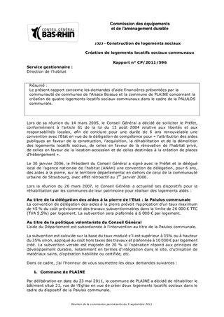 Le présent rapport concerne les demandes daide financières présentées par la communauté de communes de l'Alsace Bossue et la commune de PLAINE concernant la création de quatre logements locatifs sociaux communaux dans le cadre de la PALULOS communale.