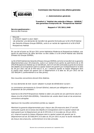Le présent rapport a pour objet : -de présenter une demande de transfert de garantie formulée par la SA dHLM Habitat des Salariés dAlsace-Groupe DOMIAL, suite à un rachat de logements à la SA dHLM Perspectives Habitat