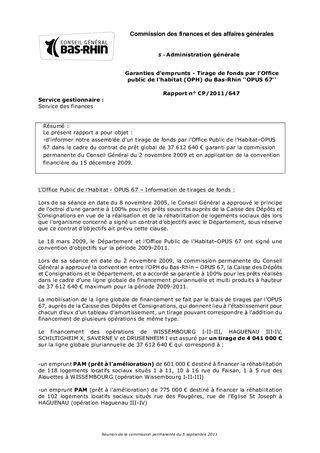 Le présent rapport a pour objet : -dinformer notre assemblée dun tirage de fonds par lOffice Public de lHabitatOPUS 67 dans le cadre du contrat de prêt global de 37 612 640 € garanti par la commission permanente du Conseil Général du 2 novembre 2009 et en application de la convention financière du 15 décembre 2009.