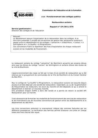 Le département assure lorganisation de la restauration dans les collèges. A ce titre sont présentés 3 projets de conventions de gestion des restaurants scolaires à passer entre le département et les collèges « Lamartine » à Bischheim, « Leclerc » à Schiltigheim et « La Souffel » à Pfulgriesheim. Ces conventions fixent la répartition des frais dexploitation de chaque restaurant scolaire et les modalités de financement.