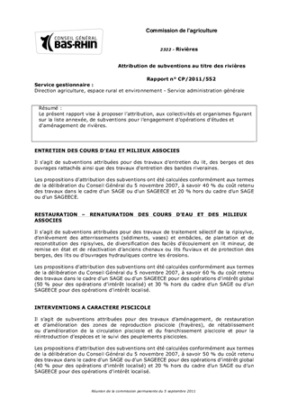 Le présent rapport vise à proposer lattribution, aux collectivités et organismes figurant sur la liste annexée, de subventions pour lengagement dopérations détudes et daménagement de rivières.