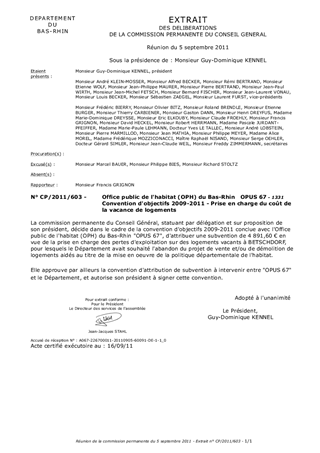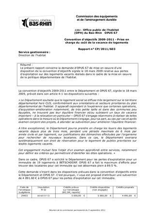 Le présent rapport concerne la demande d'OPUS 67 de mise en oeuvre d'une disposition de la convention d'objectifs signée le 18 mars 2009 relative aux pertes d'exploitation sur des logements vacants réalisés dans le cadre de la mise en oeuvre de la politique départementale de l'habitat.