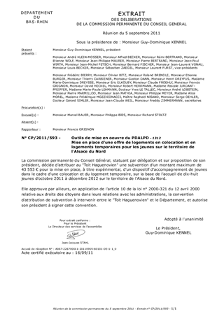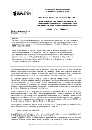 Ce rapport porte sur la demande du Toit Haguenovien concernant la mise en place, à titre expérimental, d'un dispositif d'accompagnement de jeunes dans le cadre d'une colocation et du logement temporaire, sur la base de l'accueil de 18 jeunes d'octobre 2011 à décembre 2012. Cette action s'incrit, d'une part, dans le cadre de la politique jeunesse initiée par le Conseil Général et, d'autre part, dans le cadre de la mise en oeuvre du plan départemental d'action pour le logement des personnes défavorisées signé conjointement par le Préfet, le Président du Conseil Général, le Président de la communauté urbaine de Strasbourg, le Président et le Directeur de la caisse d'allocations familiales du Bas-Rhin.