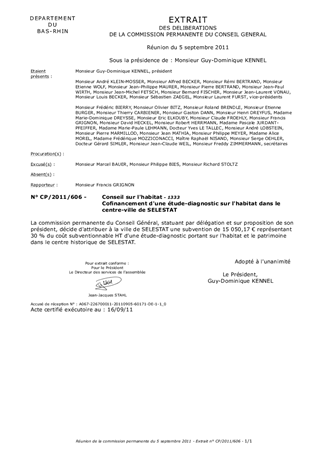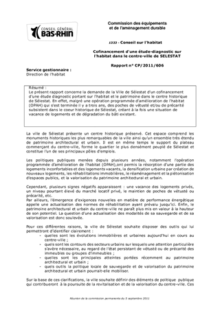 Le présent rapport concerne la demande de la Ville de Sélestat d'un cofinancement d'une étude diagnostic portant sur l'habitat et le patrimoine dans le centre historique de Sélestat. En effet, malgré une opération programmée d'amélioration de l'habitat (OPAH) qui s'est terminée il y a trois ans, des poches de vétusté et/ou de précarité subsistent dans le coeur historique de Sélestat, créant à la fois une situation de vacance de logements et de dégradation du bâti existant.