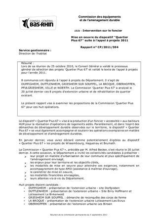 Lors de sa réunion du 25 octobre 2010, le Conseil Général a validé le processus général de sélection des projets 'Quartier Plus 67' et validé le texte de l'appel à projets pour l'année 2011. 8 communes ont répondu à l'appel à projets du Département. Il s'agit de DUPPIGHEIM, DUTTLENHEIM, GRIESHEIM SUR SOUFFEL, LA BROQUE, OBERHOFFEN, PFULGRIESHEIM, VILLE et WOERTH. La Commission 'Quartier Plus 67' a analysé le 20 juillet dernier ces 8 projets d'extension urbaine et de réhabilitation de quartier existant. Le présent rapport vise à examiner les propositions de la Commission 'Quartier Plus 67' pour ces huit opérations.