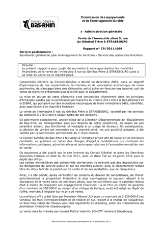 Le présent rapport a pour projet de soumettre à votre approbation les modalités financières de la vente de l'immeuble 5 rue du Général Frère à STRASBOURG suite à sa mise en vente sur le marché privé.