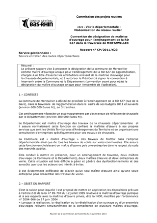 Le présent rapport vise à proposer la désignation de la commune de Mertzwiller comme maître douvrage unique pour laménagement de la RD 627 en agglomération, chargée à ce titre dexercer les attributions relevant de la maîtrise douvrage pour la chaussée départementale, et à autoriser le Président à signer la convention à intervenir entre la Commune et le Département (convention ayant pour objet la désignation du maître douvrage unique pour lensemble de lopération).