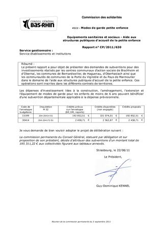 Le présent rapport a pour objet de présenter des demandes de subventions pour des investissements réalisés par les centres communaux d'action sociale de Bischheim et d'Obernai, les communes de Bernardswiller, de Haguenau, d'Oberhaslach ainsi que les communautés de communes de la Porte du Vignoble et du Pays de Marmoutier dans le domaine de l'aide aux structures publiques d'accueil de la petite enfance. Ces opérations sont inscrites dans les différents contrats de territoires.