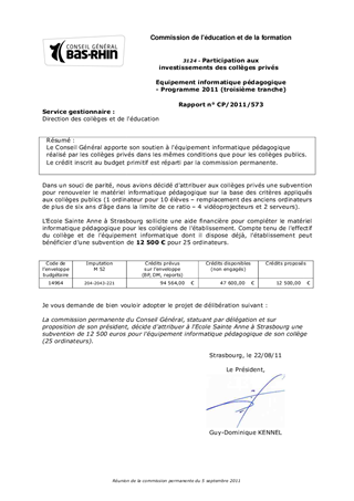 Le Conseil Général apporte son soutien à l'équipement informatique pédagogique réalisé par les collèges privés dans les mêmes conditions que pour les collèges publics. Le crédit inscrit au budget primitif est réparti par la commission permanente.