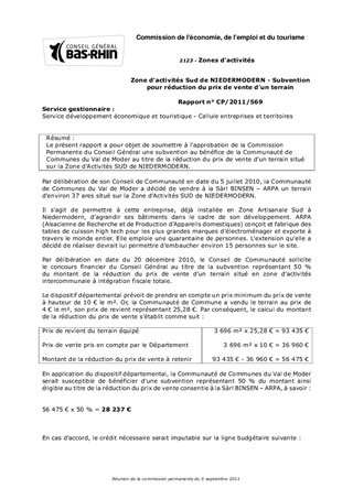 Le présent rapport a pour objet de soumettre à l'approbation de la Commission Permanente du Conseil Général une subvention au bénéfice de la Communauté de Communes du Val de Moder au titre de la réduction du prix de vente d'un terrain situé sur la Zone d'Activités SUD de NIEDERMODERN.