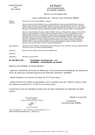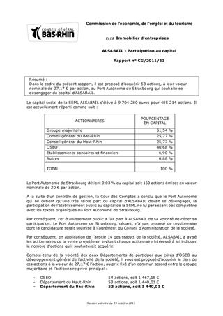 Dans le cadre du présent rapport, il est proposé dacquérir 53 actions, à leur valeur nominale de 27,17 € par action, au Port Autonome de Strasbourg qui souhaite se désengager du capital dALSABAIL.